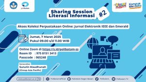 Sharing Session Literasi Informasi merupakan program rutin Perpustakaan Polibatam untuk meningkatkan literasi informasi sivitas akademika melalui pelatihan pemanfaatan sumber digital dan layanan perpustakaan terkini. Pada sesi kali ini, materi akan berfokus pada pemanfaatan akses eJournal Emerald dan IEEE guna mendukung kebutuhan riset, studi, dan penulisan ilmiah civitas Polibatam.